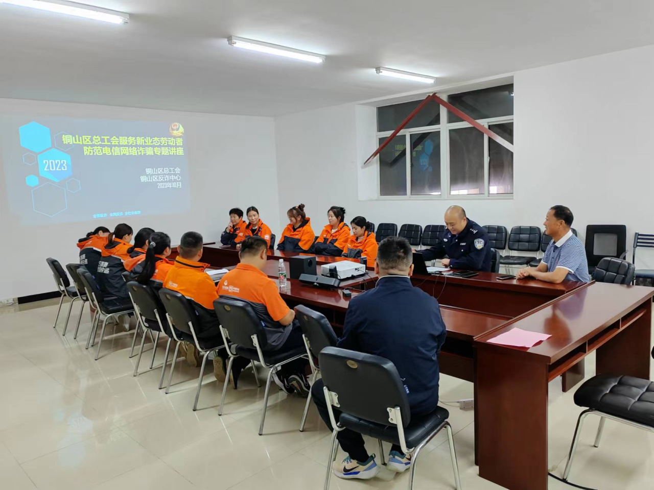 近日,铜山区总工会新就业形态劳动者服务小分队,先后到铜山万达商圈、张集镇申通为群快运有限公司和茅村镇檀山村等地,为广大新就业形态劳动者开设防范电信网络诈骗小课堂,提高大家的防诈反诈意识和本领。 服务小分队先是来到铜山万达商圈党群服务中心为大家授课,在市、区党工建指导员赵传利、张邦松等同志的精心组织下,来自商圈内的外卖小哥、商场信息员、保安员等新就业形态劳动者30余人参加听课。小分队队员——区公安局反诈中心主任刘烨结合商圈人员的职业特点和工作内容等实际情况,对在工作和生活中如何防范电信网络诈骗作了细致讲解,并对大家的提问进行了耐心的解答。听课人员中有一位50多岁的女职工现场反映了自己遭遇网络诈骗的经过,希望给予帮助,刘主任详细询问了女职工是如何上当受骗的、受骗金额多少等情况,并对女职工关心的问题作了解答,并答应继续帮助该女工处理好这次受骗问题,挽回经济损失。
