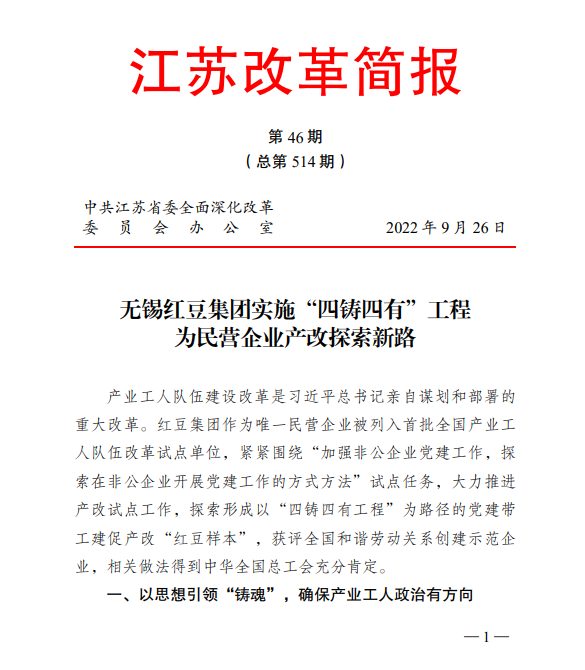 近期,中共江苏省委改革办印发2022年第46期《江苏改革简报》,从“以思想引领‘铸魂’,确保产业工人政治有方向;以素质提升‘铸匠’,确保产业工人事业有希望;以精致服务‘铸爱’,确保产业工人生活有保障;以身心关爱‘铸家’,确保产业工人情绪有释放”四个方面,向中央全面深化改革委员会办公室报送,向全省推介无锡红豆集团“四铸四有”产改工作经验做法。
