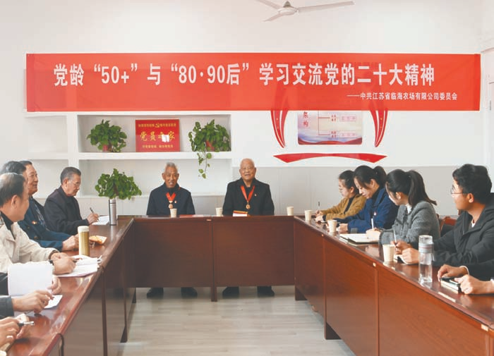 江苏省临海农场有限公司党委采取多种形式学习宣传贯彻党的二十大精神,让职工群众领悟新思想、新论断、新部署、新要求。图为50年以上党龄的老同志与80、90后青年职工交流分享学习心得。