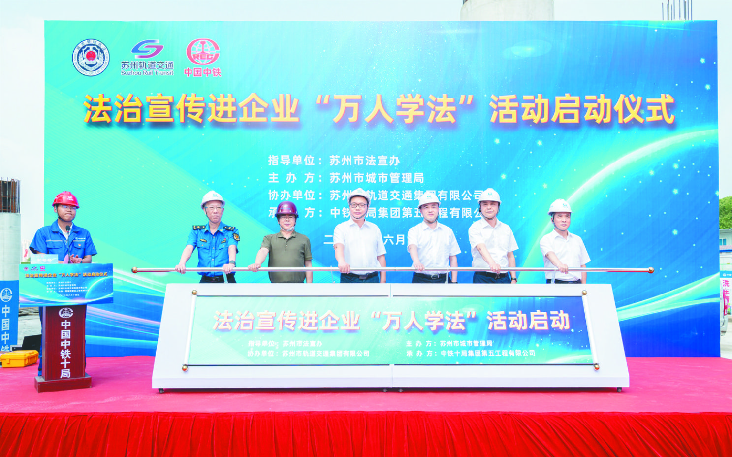 昨日,苏州市司法局、城市管理局法治宣传进企业“万人学法”活动,在苏州市轨道交通8号线镬底潭车辆段项目1标中铁十局施工现场正式启动。活动将通过开展法治宣传与教育,引导企业管理人员和广大建筑工人形成办事依法、遇事找法、解决问题用法、化解矛盾靠法的良好习惯。