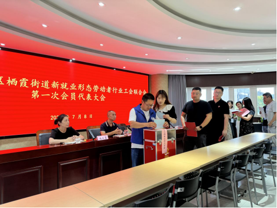 会中,召开了栖霞街道新就业形态劳动者行业工会联合会第一届委员会第一次全体会议,会议通过民主程序,选举产生了第一届新就业形态劳动者行业工会联合会主席、副主席,经费审查委员会主任,女职工委员会主任和劳动法律监督委员会主任。