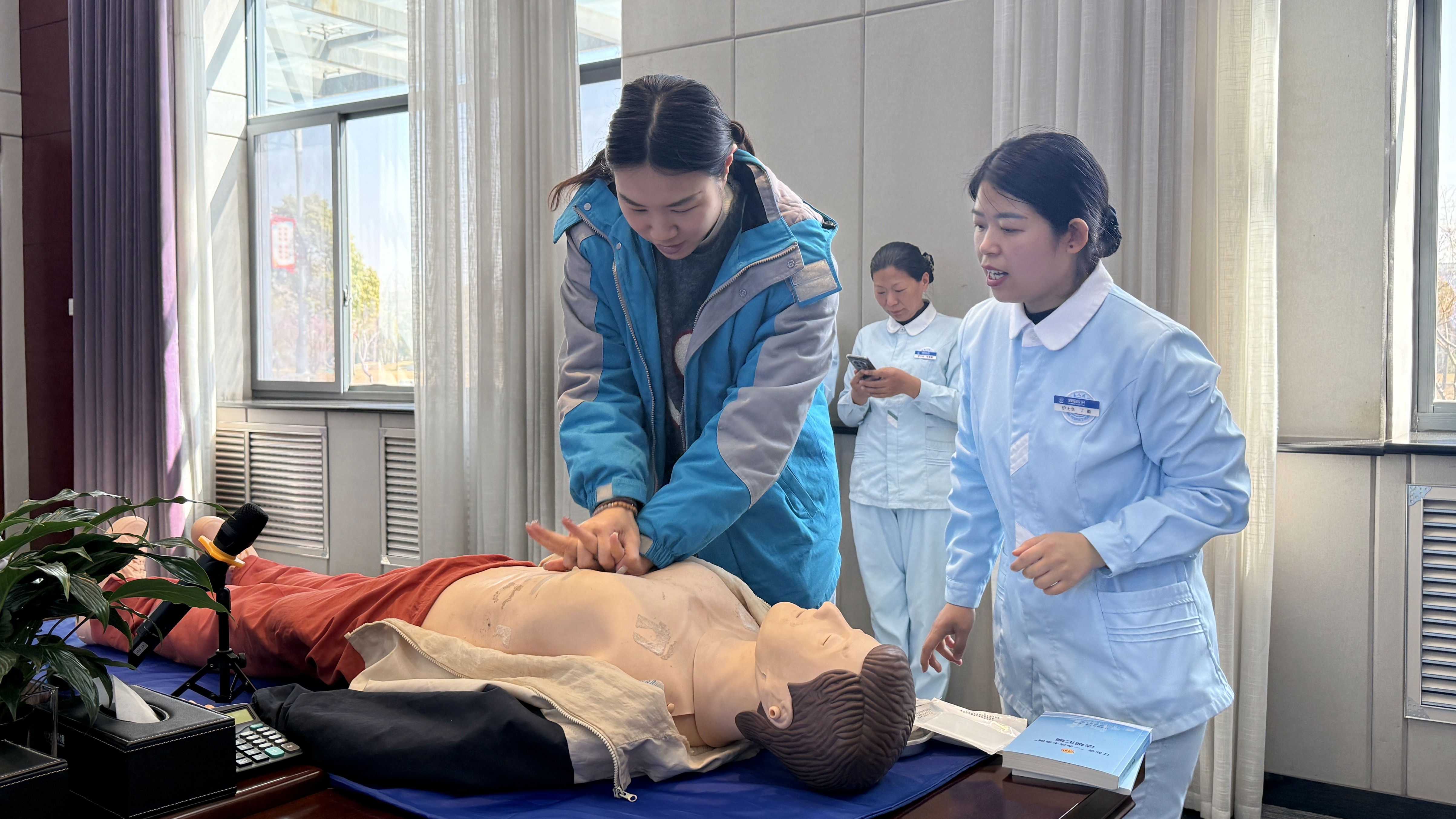 活动伊始,任静用通俗易懂的语言围绕“心肺复苏”相关知识,详细为职工群众讲解心肺复苏操作原理、胸外按压操作步骤以及自动体外除颤仪(AED)的使用方法等急救救护知识。活动中,任静还利用模拟假人对判断呼吸、胸外按压及人工呼吸等急救技能进行现场演练,教会职工在遇到紧急状况时如何抓住宝贵的“黄金4分钟”抢救患者。