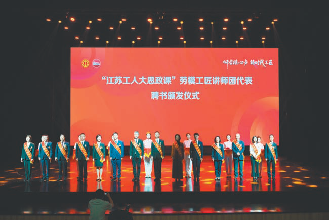 活动中,全国劳模、大国工匠培育对象、启东中远海运海洋工程有限公司海工与新能源研发中心电气室主任黄剑宣读了《紧跟核心坚定前行 立足岗位建功立业——江苏省2025年全国劳动模范和先进工作者倡议书》。刚刚从北京载誉归来的14位劳模先进被聘为“江苏工人大思政课”劳模工匠讲师团讲师。(王鑫)